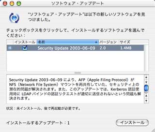 ソフトウェアアップデートで Security Update 2003-06-09 1.0 (1.4MB) が配布されています。