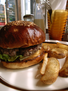 そして出てきたハンバーガーがこちら。ボリュームたっぷりです。トマトが入ったらさらに大きくなるんだろうなー。んで、このパンが、とても美味しいのです。メニューにも「特製の天然酵母パンを使用しています」とあったとおり、ちょっとこだわりのパンらしい。バンズをこんがりトーストしてあるので、外はさくっとしていながら、中はふわっともちもち、香りもいいです。そしてパティはごっつくて、ハンバーグというよりは「肉っ」って感じで食べごたえあり。しかし迫力はちょっとパンに負けてるかな、それぐらいパンにインパクトがあります。